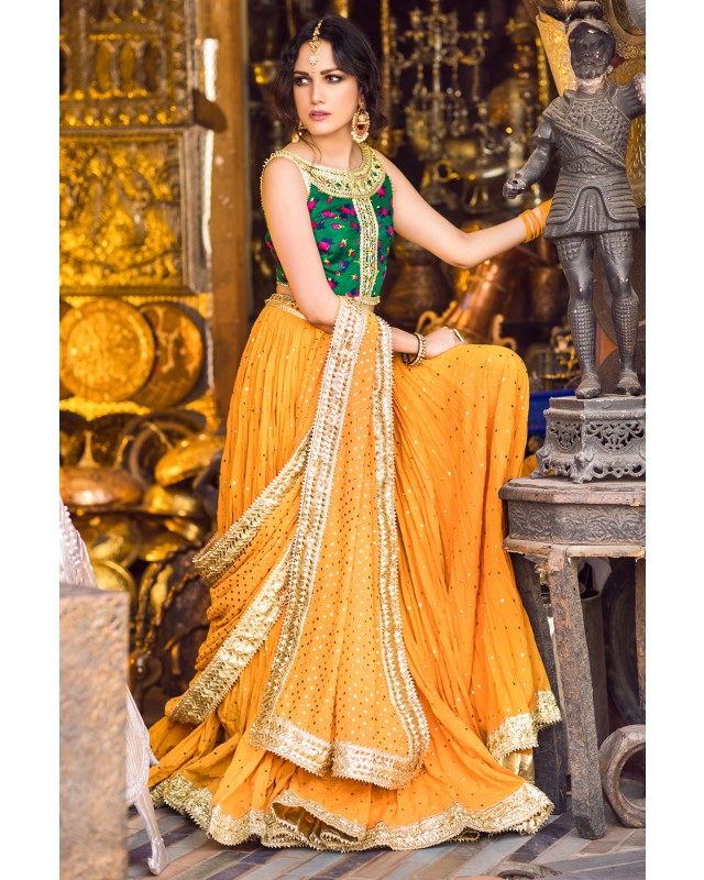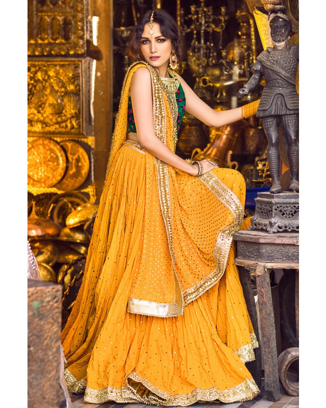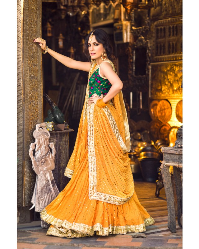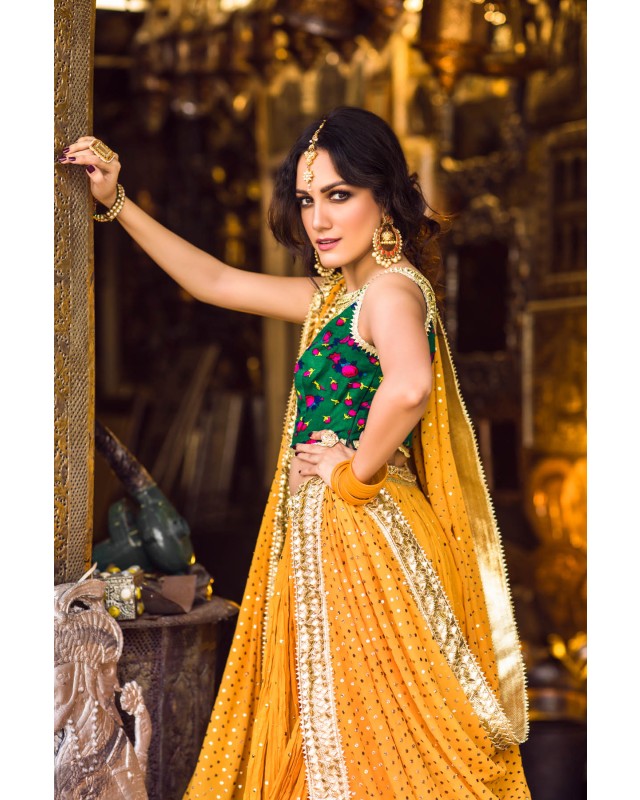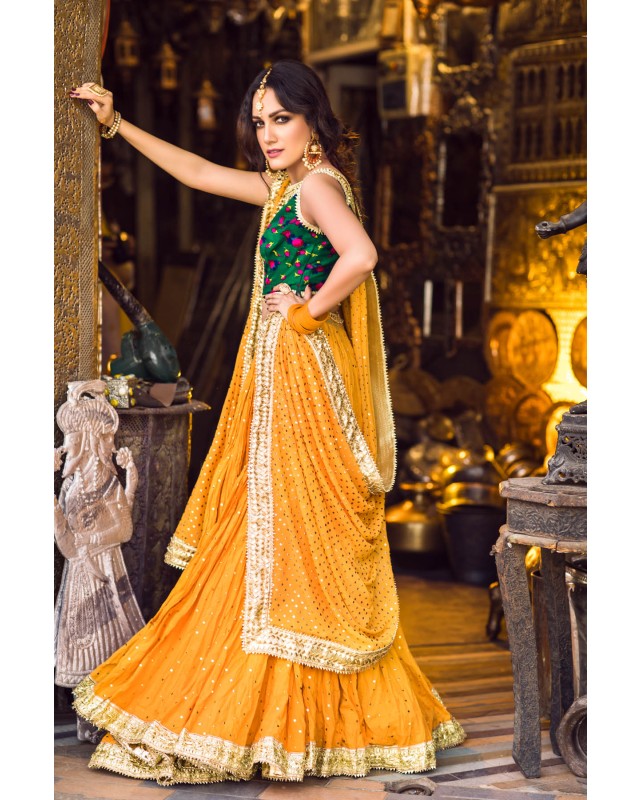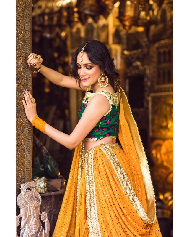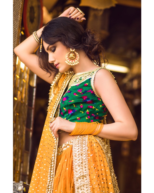 Deep Green cheent gota worked choli worn with a voluminous crushed cotton ghagra and georgette dupatta. Both ghagra and dupatta are showered with intricate kaamdani.