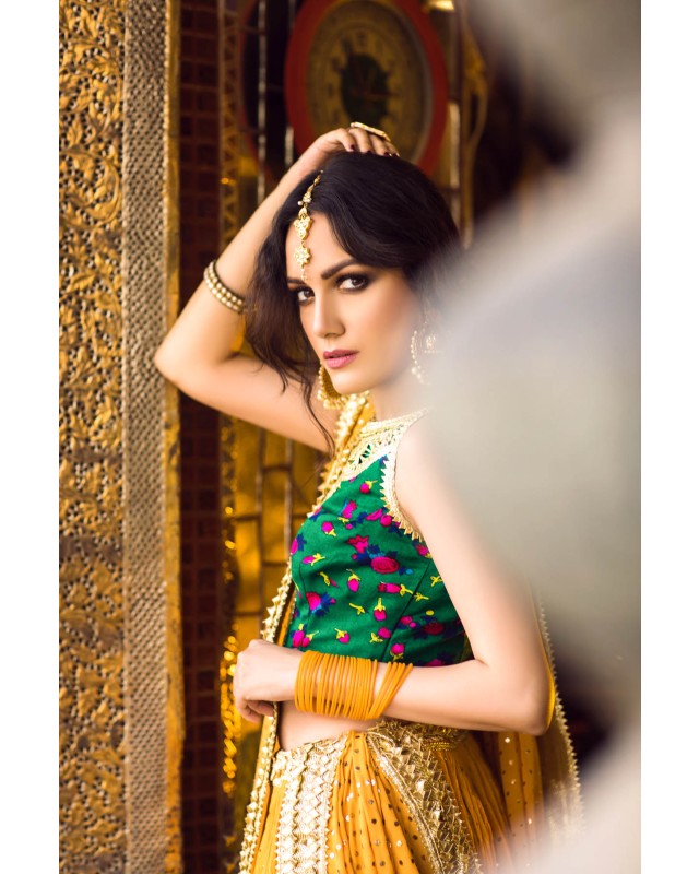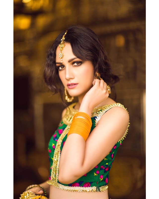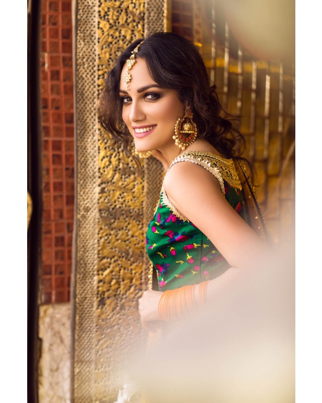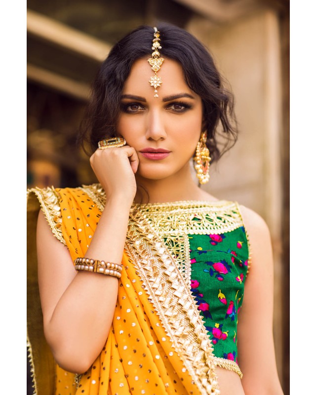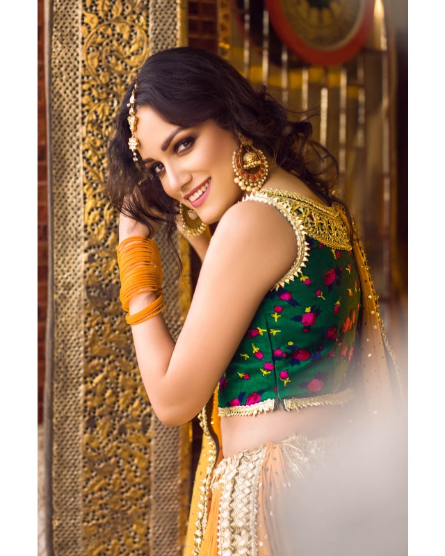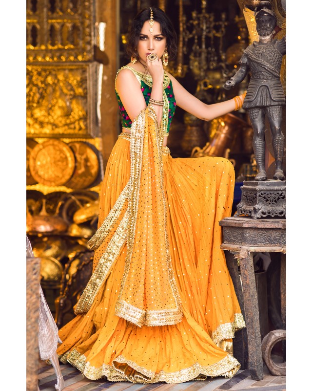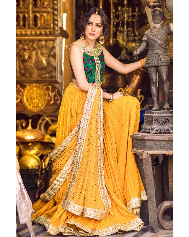 Deep Green cheent gota worked choli worn with a voluminous crushed cotton ghagra and georgette dupatta. Both ghagra and dupatta are showered with intricate kaamdani.